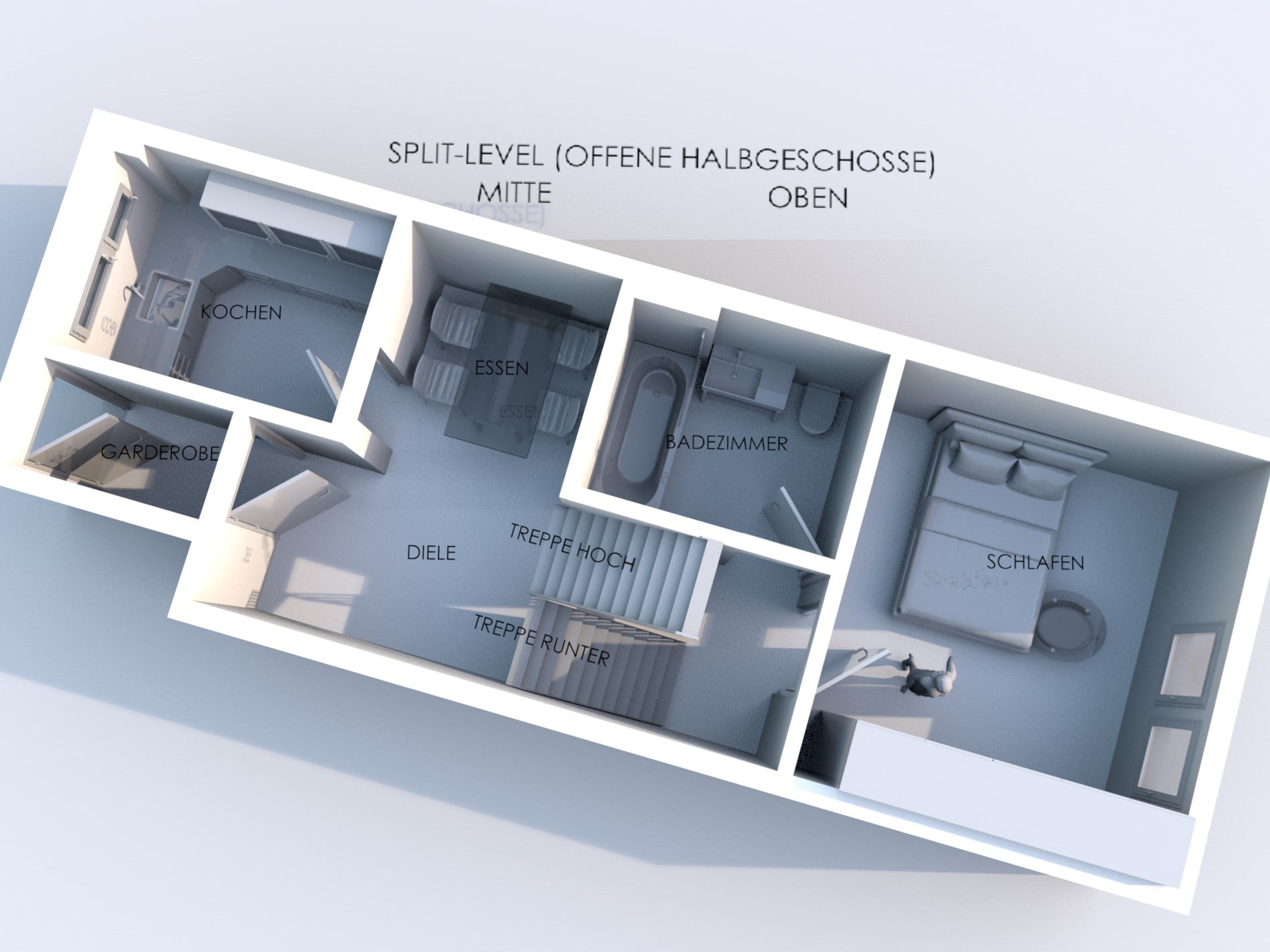 Der architektonisch aufgelockerte Grundriss ermöglicht bereits von hier aus spannende Blickachsen innerhalb der Wohnung: Über eine Treppe gelangt man ein halbes Geschoss nach oben zum Badezimmer und Schlafzimmer, während eine zweite Treppe hinab in das großzügige Wohnzimmer führt.