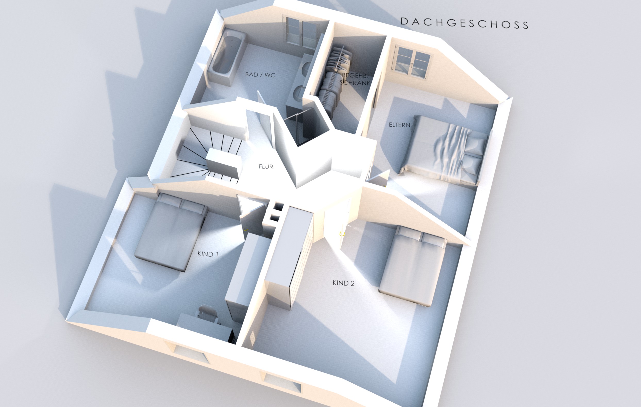 Das Dachgeschoss beeindruckt ebenfalls mit einem sehr individuellen Grundriss und bietet neben einem geräumigen Master-Schlafzimmer zwei weitere helle Zimmer, ideal als Kinder-, Gäste- oder Arbeitszimmer nutzbar. Abgerundet wird diese Ebene durch ein modernes, stilvoll ausgestattetes Badezimmer mit Dusche und großzügiger Badewanne.