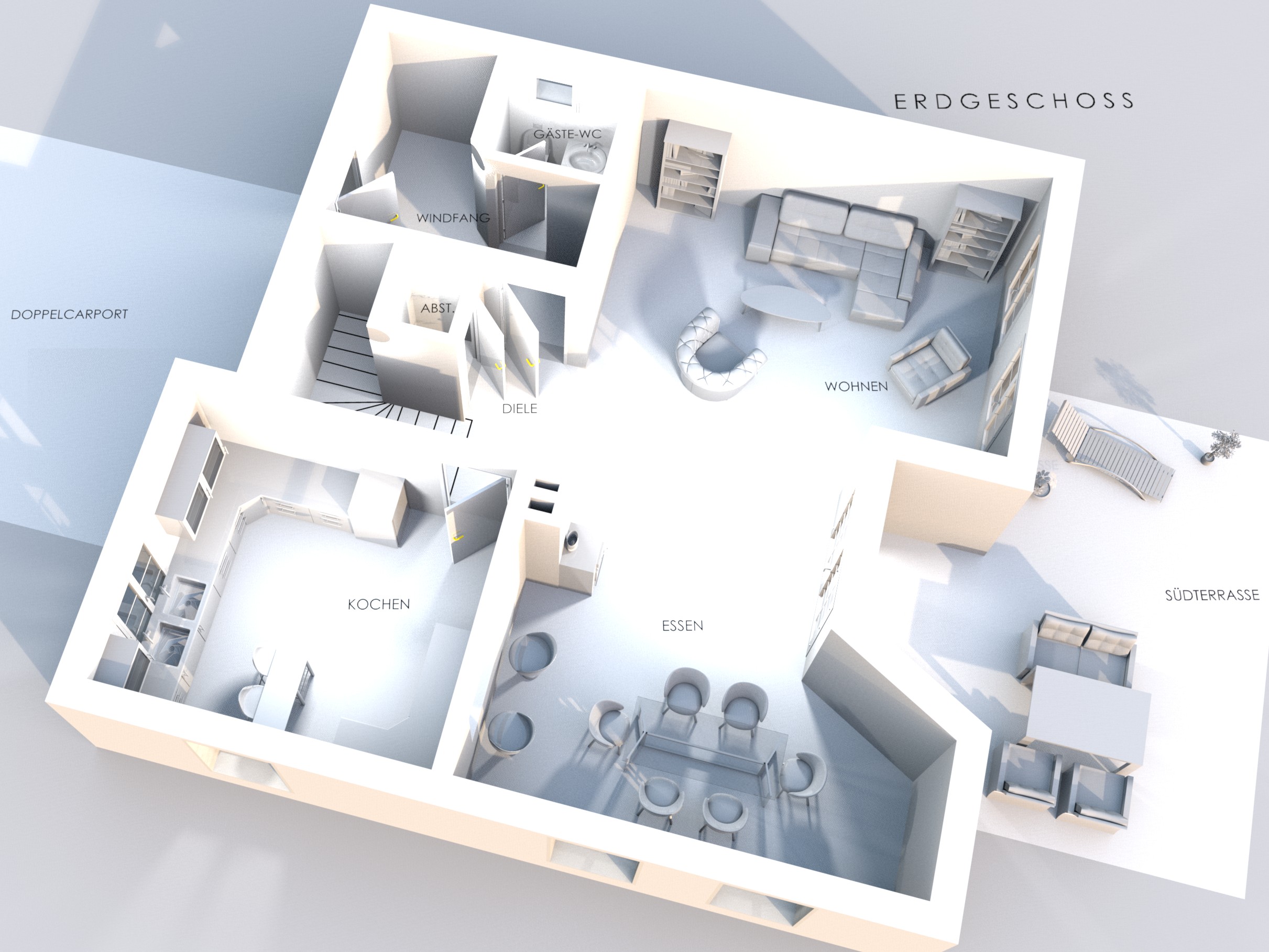 Das Haus überzeugt durch einen individuell geplanten Grundriss ohne Durchgangszimmer. Auf allen Etagen ermöglichen zentrale Flure einen bequemen Zugang zu sämtlichen Räumen. Im Erdgeschoss verbindet ein großzügiger Durchgang den offenen Wohn-, Ess- und Kochbereich – das Herzstück des Hauses. Von hier aus führt der Weg direkt auf eine weitläufige, sonnenverwöhnte Südterrasse, die zum Verweilen im Grünen einlädt. Ein Gäste-WC befindet sich praktischerweise in unmittelbarer Nähe zum Windfang.