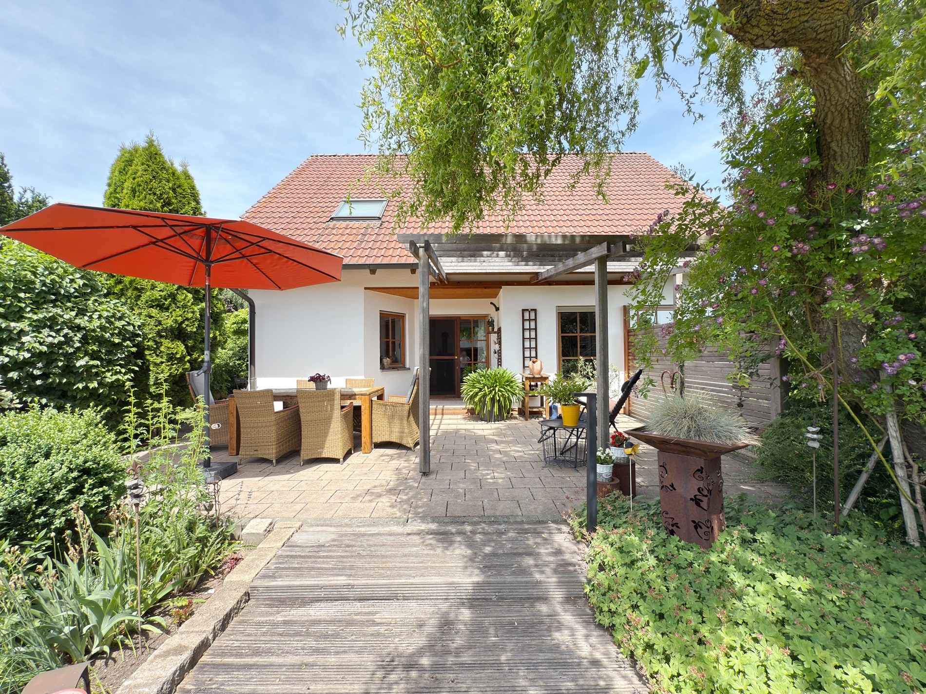 Der liebevoll gestaltete, blickgeschützte Garten mit zahlreichen Rückzugsorten ist ein echtes Highlight. Ein charmantes Gartenhaus bietet zusätzlichen Stauraum für Geräte oder dient als Winterquartier für Pflanzen. Für Fahrzeuge steht ein großzügiger Doppelcarport zur Verfügung, der zudem Platz für die Lagerung von Brennholz bereithält.