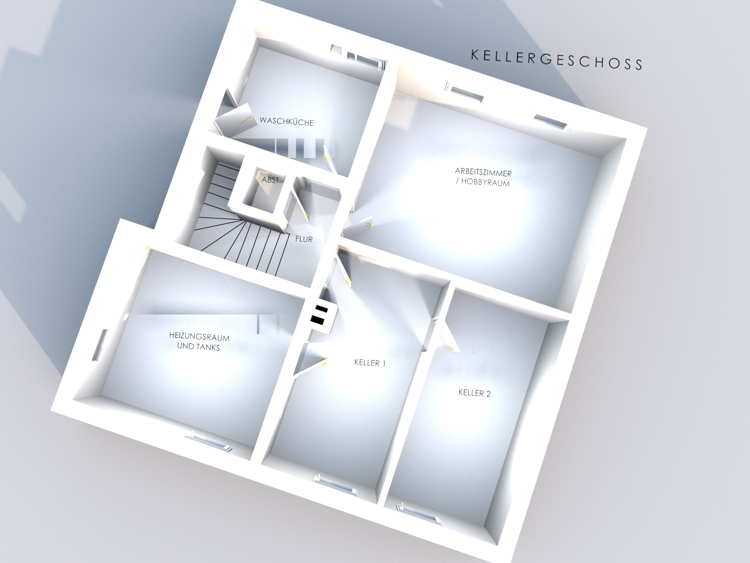 Der voll unterkellerte Bereich mit angenehmer Deckenhöhe eröffnet vielfältige Nutzungsmöglichkeiten: Ein großes Arbeits- oder Hobbyzimmer, ein Hauswirtschaftsraum mit zusätzlicher Dusche, zwei weitere Kellerräume sowie die Heizungsanlage sind hier untergebracht.