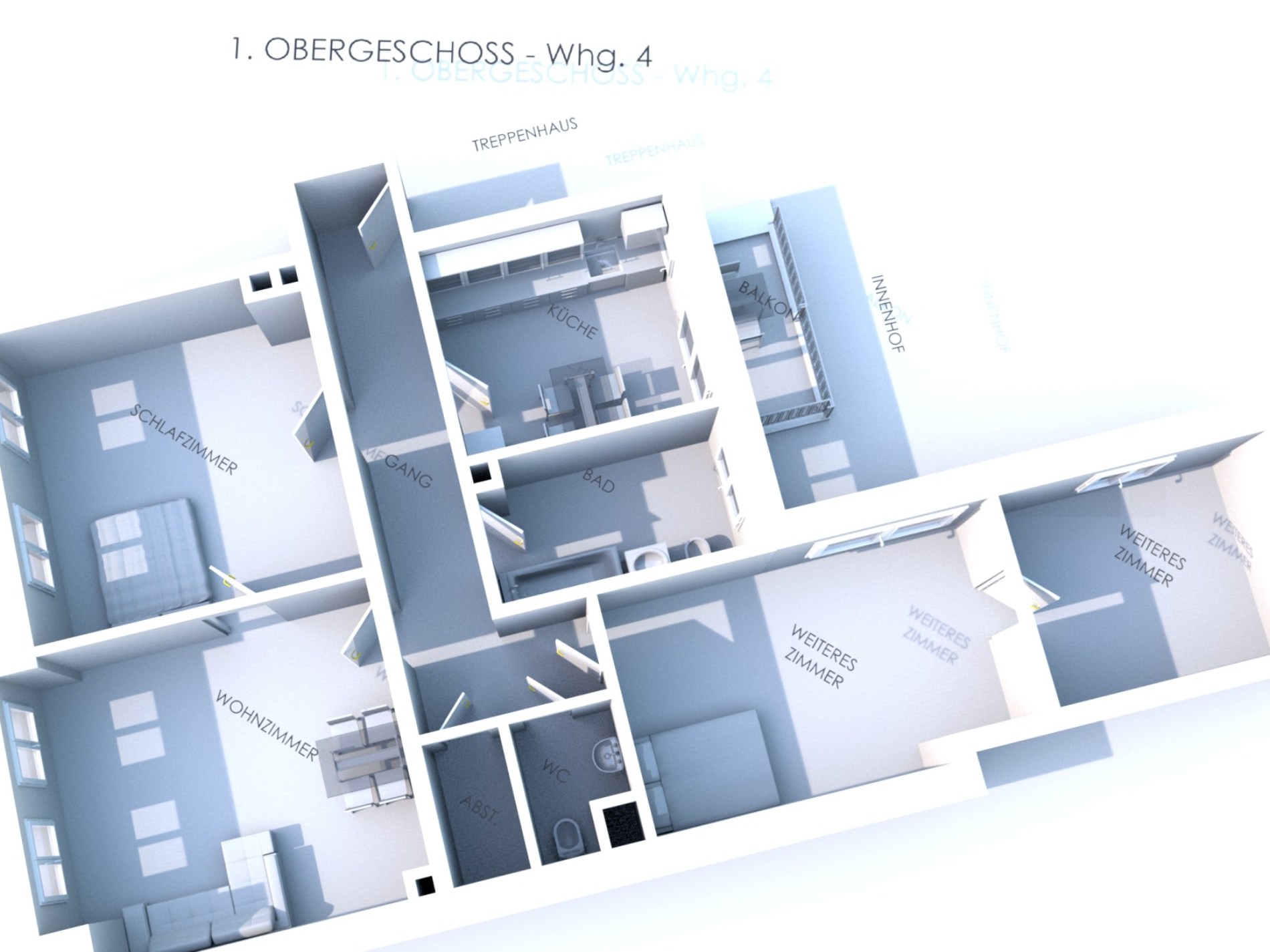 Die Wohnung überzeugt durch eine gut durchdachte Grundrissgestaltung. Ein langer Flur verbindet Schlafzimmer, Abstellraum, Küche, Bad, Gäste-WC und Wohnzimmer. Die moderne Einbauküche, die im Kaufpreis enthalten ist, bietet hohen Nutzungskomfort und führt direkt auf einen nach Süden ausgerichteten, ruhigen Balkon mit Blick in den Innenhof. Angrenzend steht ein äußerst praktischer Vorratsraum zur Verfügung.