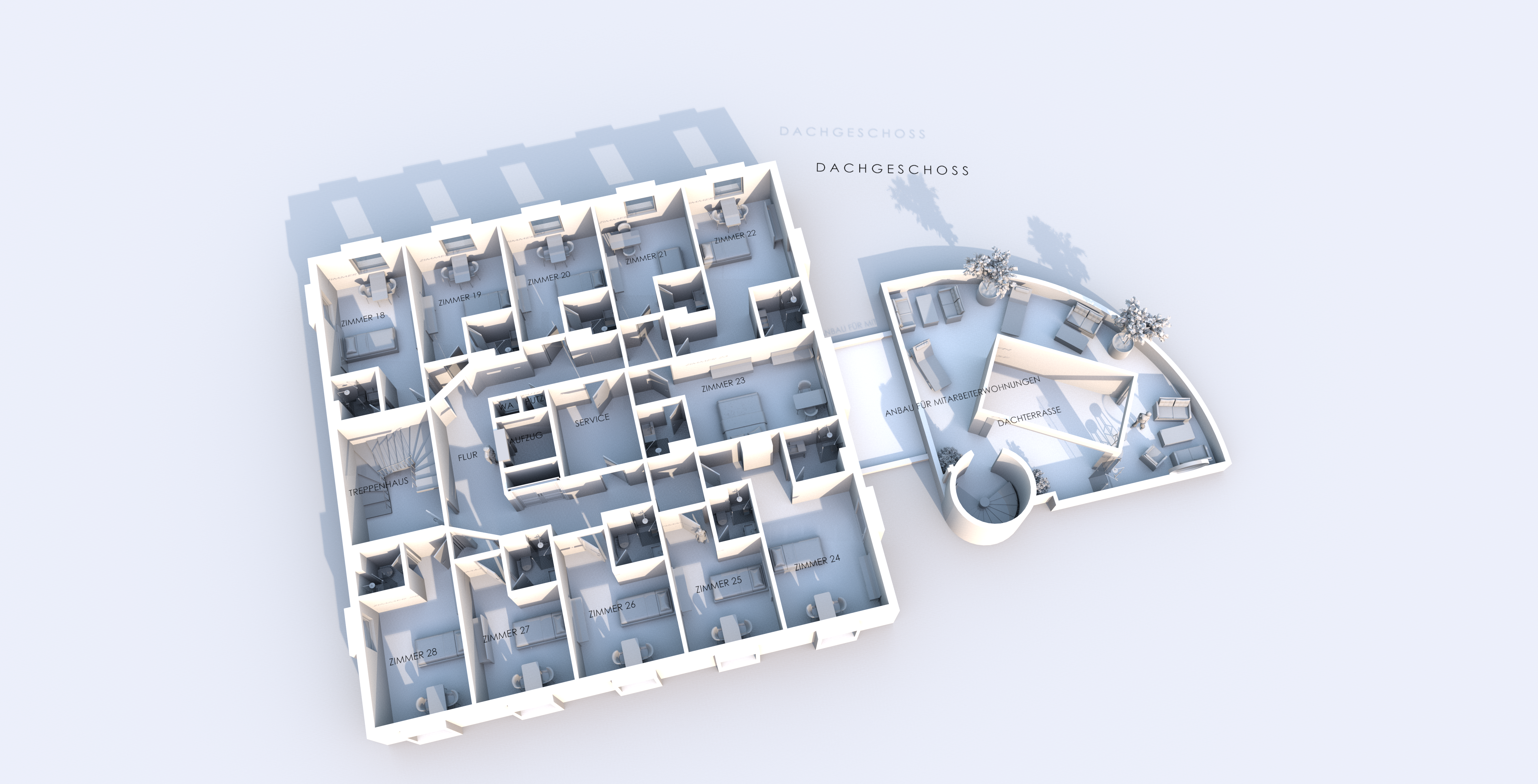 Der architektonisch markante Wohnanbau aus dem Jahr 2004 ergänzt das Ensemble um komfortable Wohnflächen für Betreiber oder leitende Mitarbeiter mit Familienanhang. Das in Massivbauweise errichtete Gebäude besticht durch eine moderne Gestaltung mit runden Fluren und einer eleganten Wendeltreppe. Die Wohnfläche beträgt rund 155 qm. Ein besonderes Highlight ist die großzügige fast 80 qm messende Dachterrasse, die sich hervorragend als private Ruhe- und Entspannungszone für Betreiber oder Management (samt Familie) eignet.