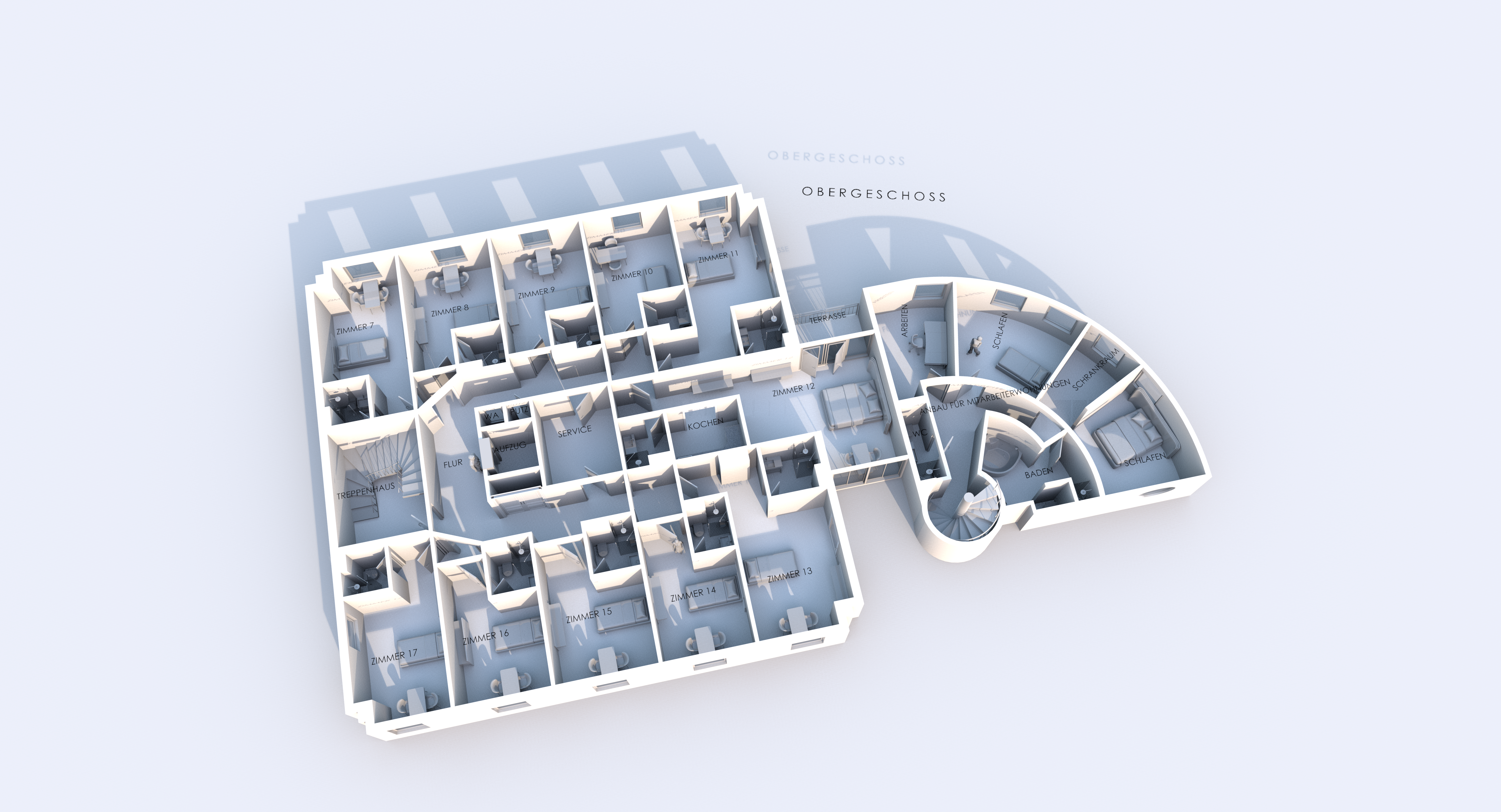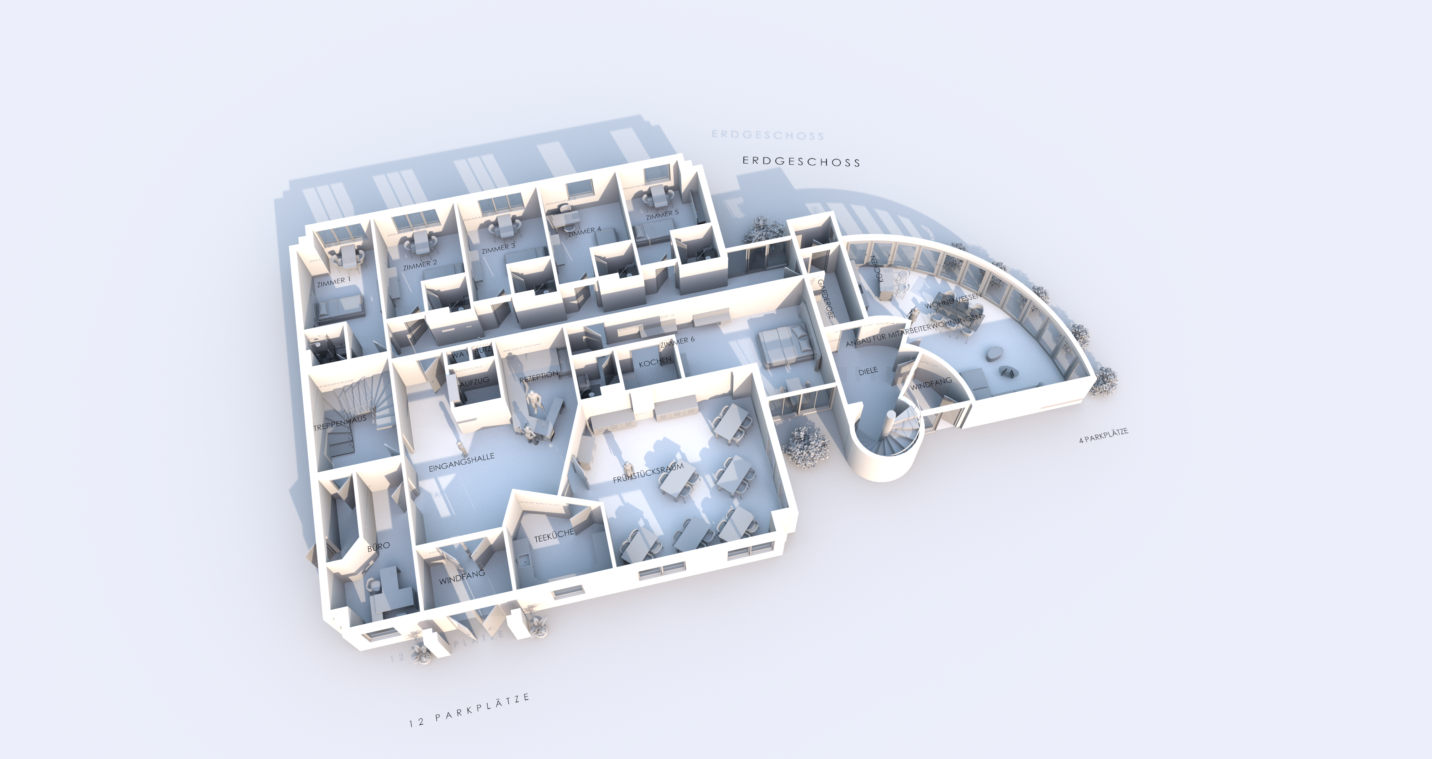 Der großzügige Eingangsbereich mit repräsentativer Hotellobby sowie der modern gestaltete Frühstücksraum mit angeschlossener Küche bilden das kommunikative Zentrum des Hauses. Ein Aufzug sowie ein großzügiges Treppenhaus mit Lichtkuppel erschließen komfortabel alle Geschosse.