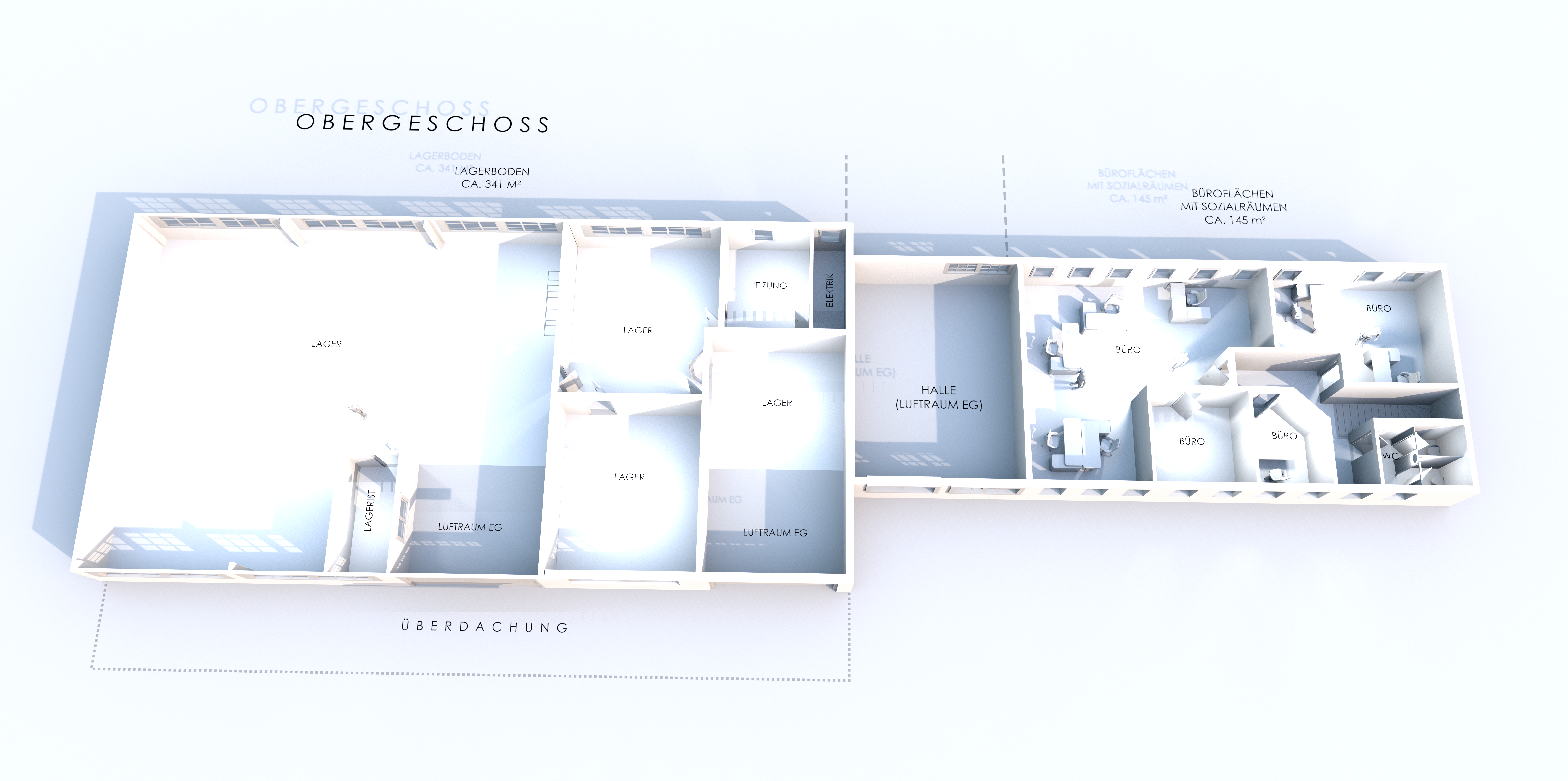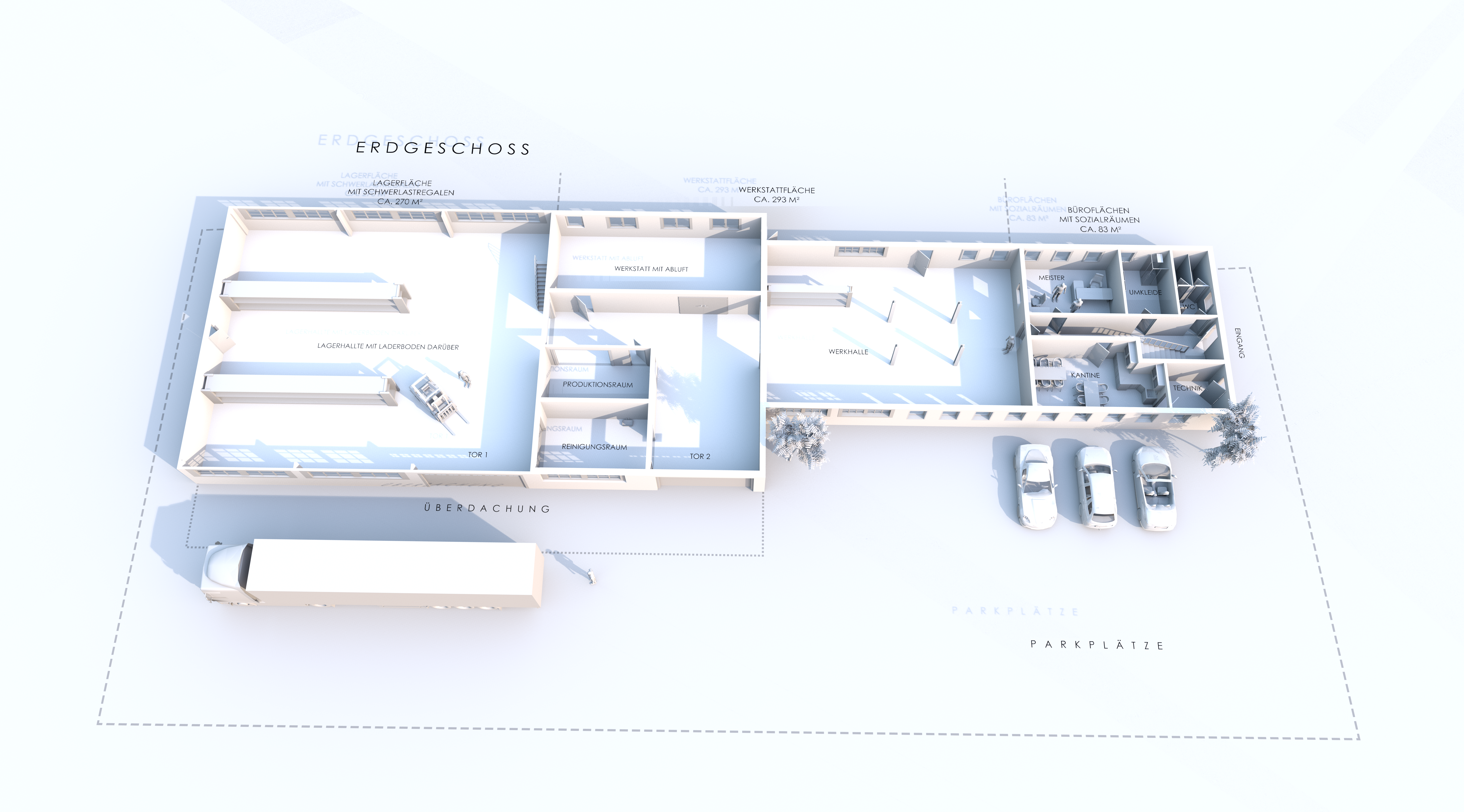 Der Übergang zwischen Lagerbereich, Lagerflächen und den als Werkstatt genutzten Werkflächen ist funktional gestaltet und fließend. Die Montage- bzw. Produktionsbereiche umfassen insgesamt ca. 293 m², die gesamte Lagerfläche beläuft sich auf rund 611 m². Die Werkflächen liegen zentral, der Büroanbau befindet sich am gegenüberliegenden Hallenende. Verbunden werden alle Bereiche durch einen mittig angeordneten, durchgehenden und breit dimensionierten Betriebsgang, der kurze Wege und effiziente Abläufe ermöglicht.