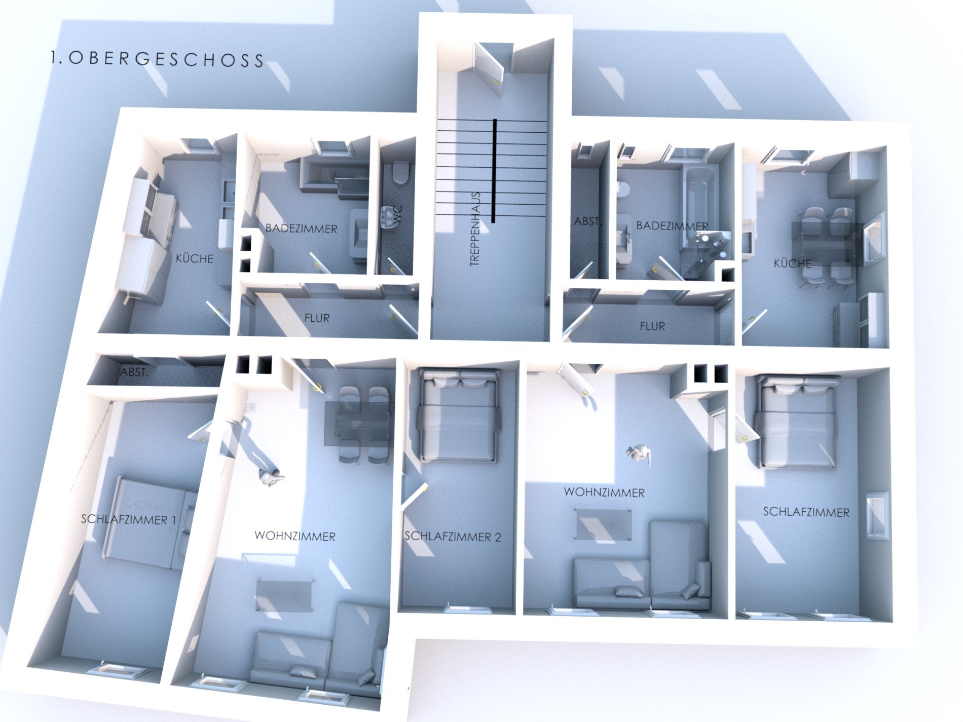 Alle Einheiten sind über einen großzügigen Treppenhausanbau erschlossen. Pro Etage befinden sich jeweils zwei Wohnungen, jeweils links und rechts des Treppenhauses. Die Wohneinheiten sind überwiegend als 2- bis 3-Zimmerwohnungen konzipiert und damit äußerst gut vermietbar. Hohe Decken und zahlreiche Fensterflächen sorgen in den Wohnungen für ein angenehmes, helles und großzügiges Raumgefühl. Auch die Dachgeschosswohnungen profitieren dank des Mansarddachs und der beachtlichen Deckenhöhen von einem überdurchschnittlichen Raumangebot.