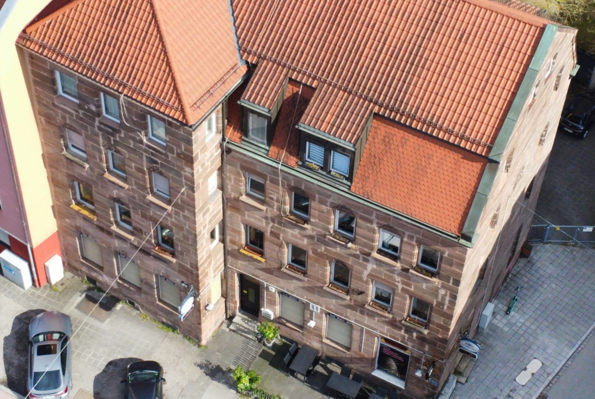 Zum Verkauf steht ein markantes historisches Wohn- und Geschäftshaus im Nürnberger äußeren Innenstadtgürtel, im Stadtteil Sandreuth. Das Gebäude wurde um das Jahr 1904 in für seine Zeit außergewöhnlich solider Bauweise mit Sandsteinquardern errichtet und überzeugt unter anderem durch ca. 51 cm starke Außenwände sowie großzügige Geschosshöhen von ca. 3,30 m, im Erdgeschoss sogar von ca. 4,10 m.