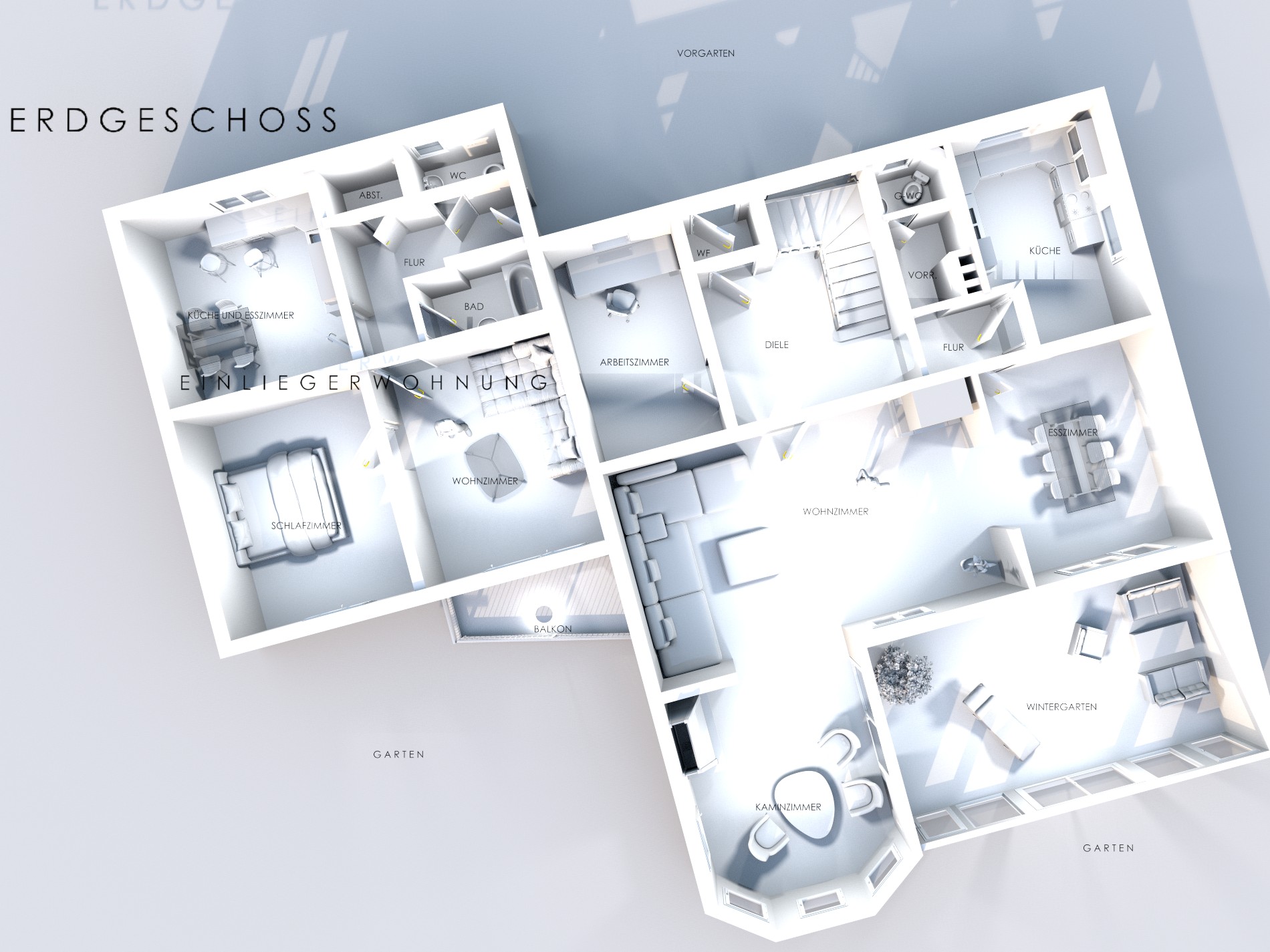 Im Erdgeschoss befinden sich sämtliche zentralen Wohnbereiche: ein großzügiges Wohnzimmer, ein geräumiges Esszimmer mit angrenzendem Kaminzimmer als behagliches Separee, ein lichtdurchfluteter Wintergarten, ein Arbeitszimmer sowie – über einen separaten Flur erreichbar – Küche und Gäste-WC.