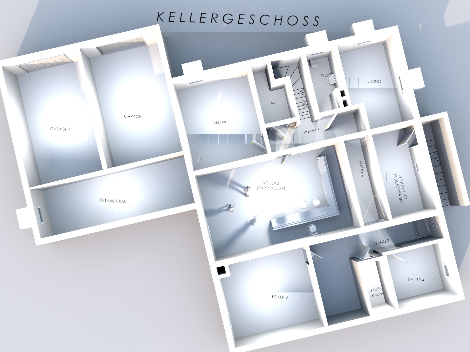 Das Kellergeschoss überzeugt durch seine außergewöhnliche Größe und gute Deckenhöhe. Mehrere Flure erschließen vier teils sehr große Kellerräume, Wasch- und Trockenraum, Kühlraum, separates WC sowie zusätzliche Abstellflächen. Der größte Raum wurde als stimmungsvoller Partykeller mit Tresen, Tanzfläche und Lichttechnik ausgebaut.
