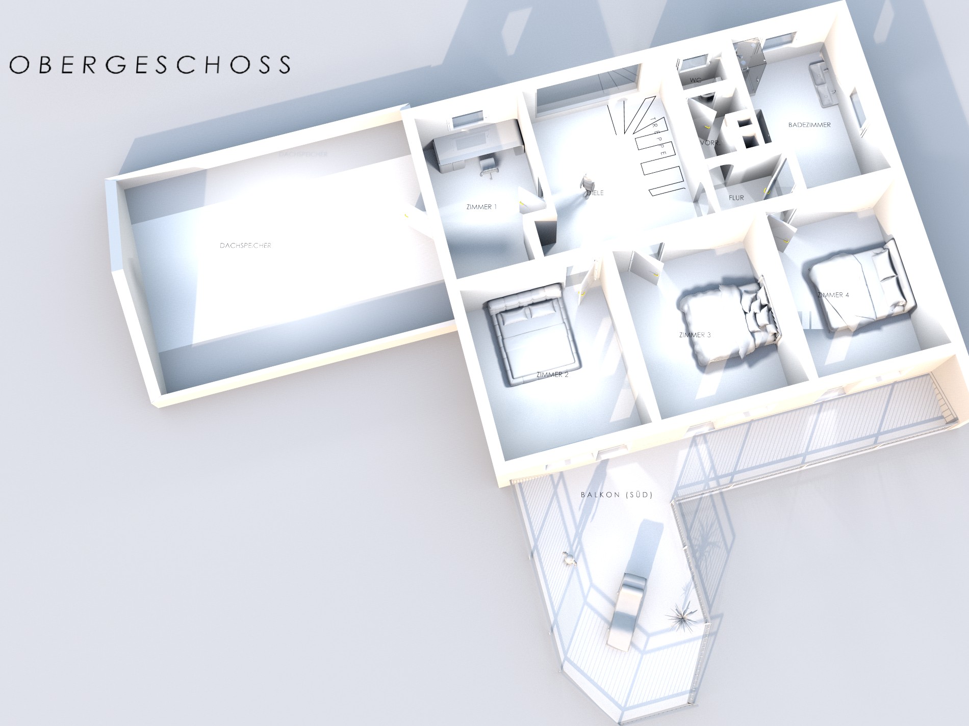 Im Obergeschoss eröffnet eine weitere große Diele den Zugang zu vier großzügigen Schlafzimmern, die sämtlich auf den durchgehenden Südbalkon führen. Dieser erstreckt sich über die gesamte Hauslänge und bietet einen herrlichen Blick in den Garten sowie in die umliegende Umgebung mit Fernblick über Höchstadt. Ergänzt wird diese Ebene durch ein separates WC und ein geräumiges Badezimmer.