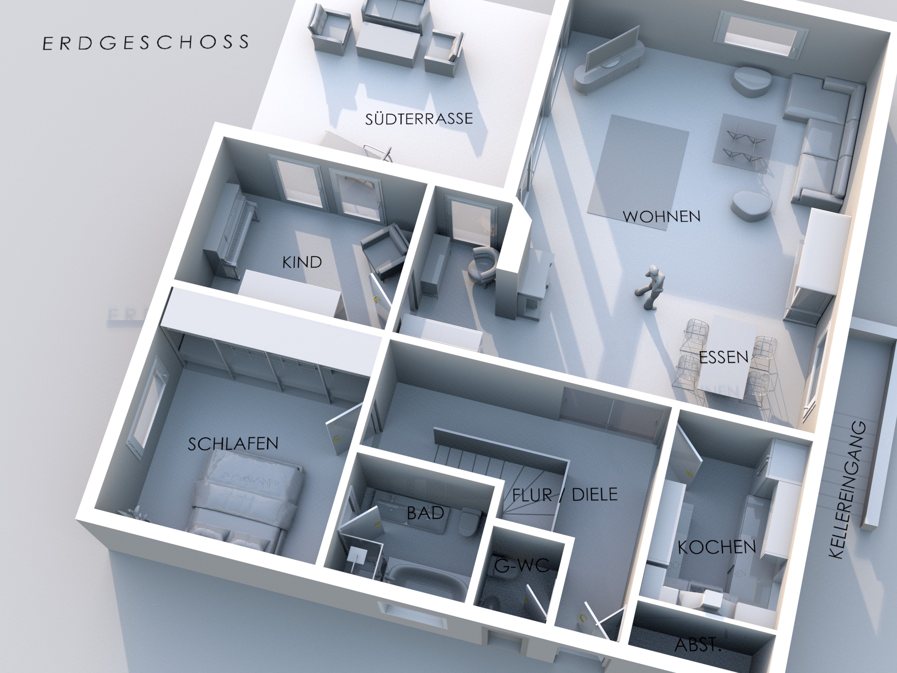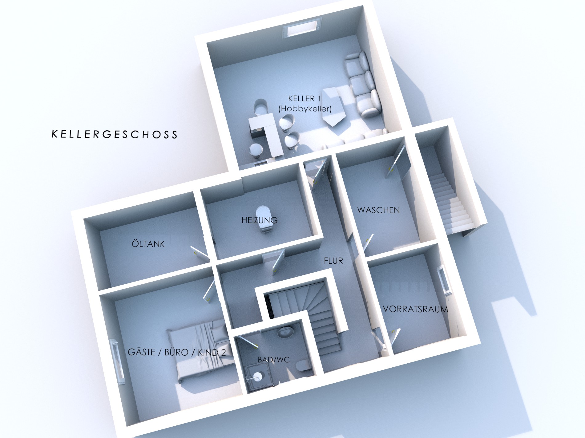 Interessant: Zusätzlicher, wohnlich nutzbarer Raum im Kellergeschoss mit über 240cm Deckenhöhe: Hobbyraum mit Fenster, helles Gästezimmer-/Arbeitszimmer mit großen Fenster und ein Vollbad, die insgesamt zusätzlich 50,2 Quadratmeter Fläche messen und zu den 117 Quadratmeter Wohnfläche dazugerechnet werden könnten.